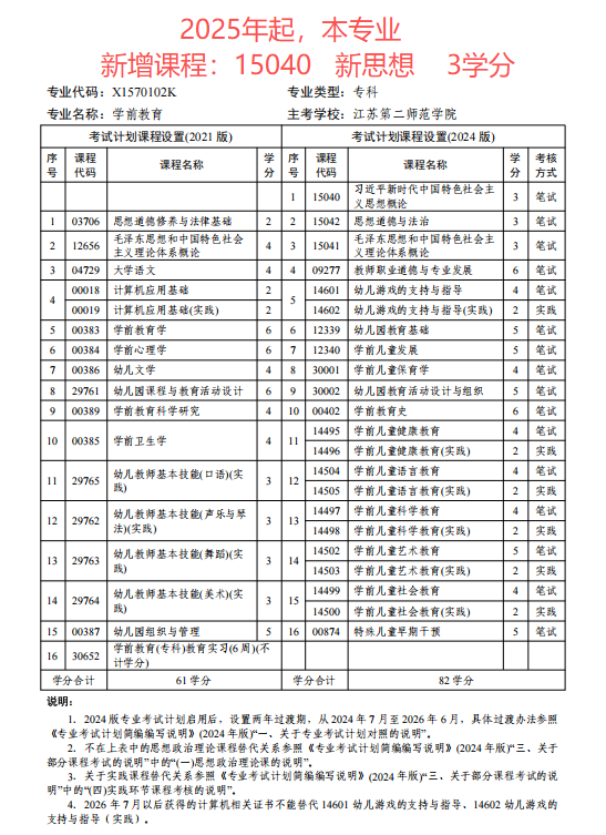 江苏自考学前教育(专科段)专业考试计划(2024版)