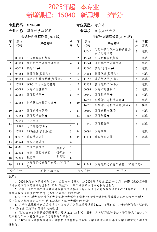 江苏省自考国际经济与贸易(本科段)专业考试计划(2024版)