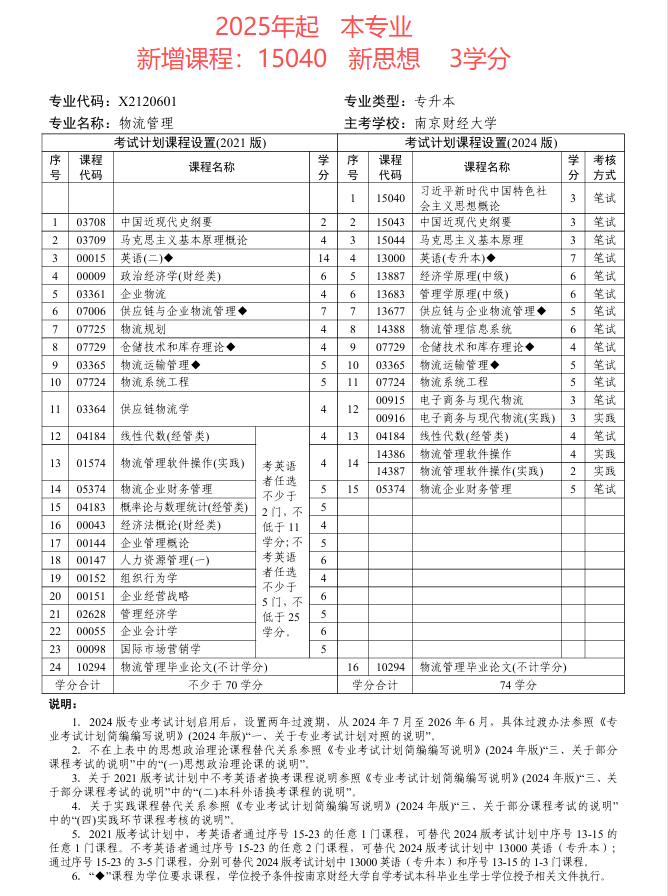 江苏省自学考试物流管理(本科段)专业考试计划(2024版)