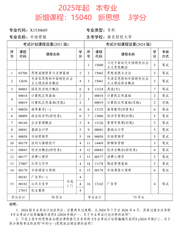 江苏省自考市场营销(专科段)专业考试计划(2024版)