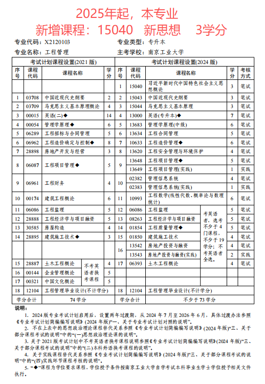 江苏自考工程管理(本科段)专业考试计划(2024版)