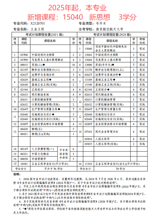 江苏省自考工业工程(本科段)专业考试计划(2024版)
