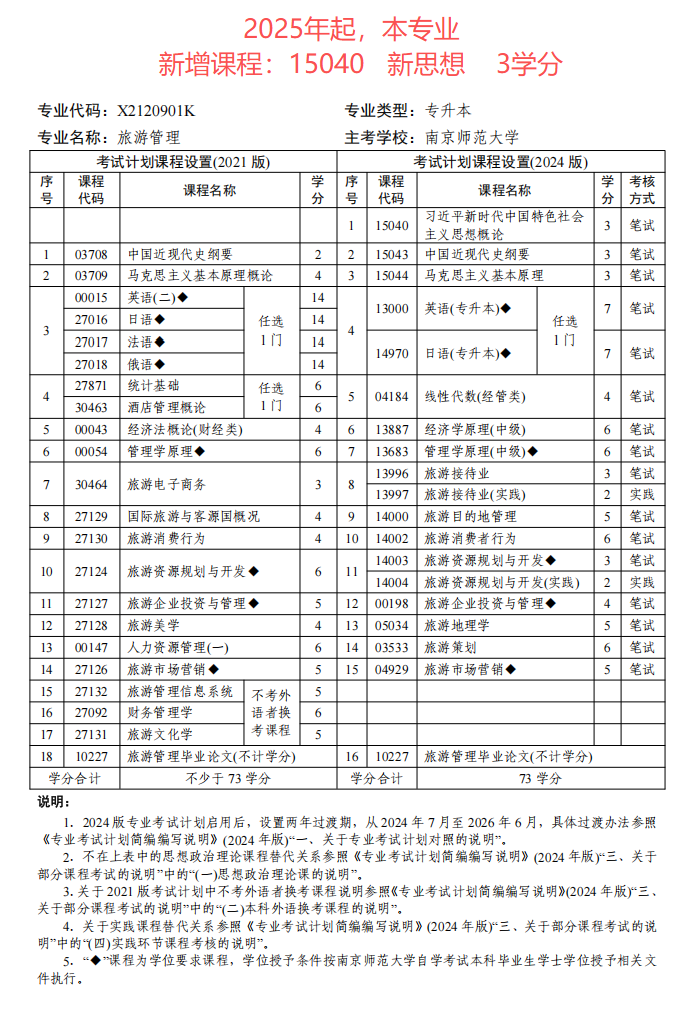 江苏自考旅游管理(本科段)专业考试计划(2024版)
