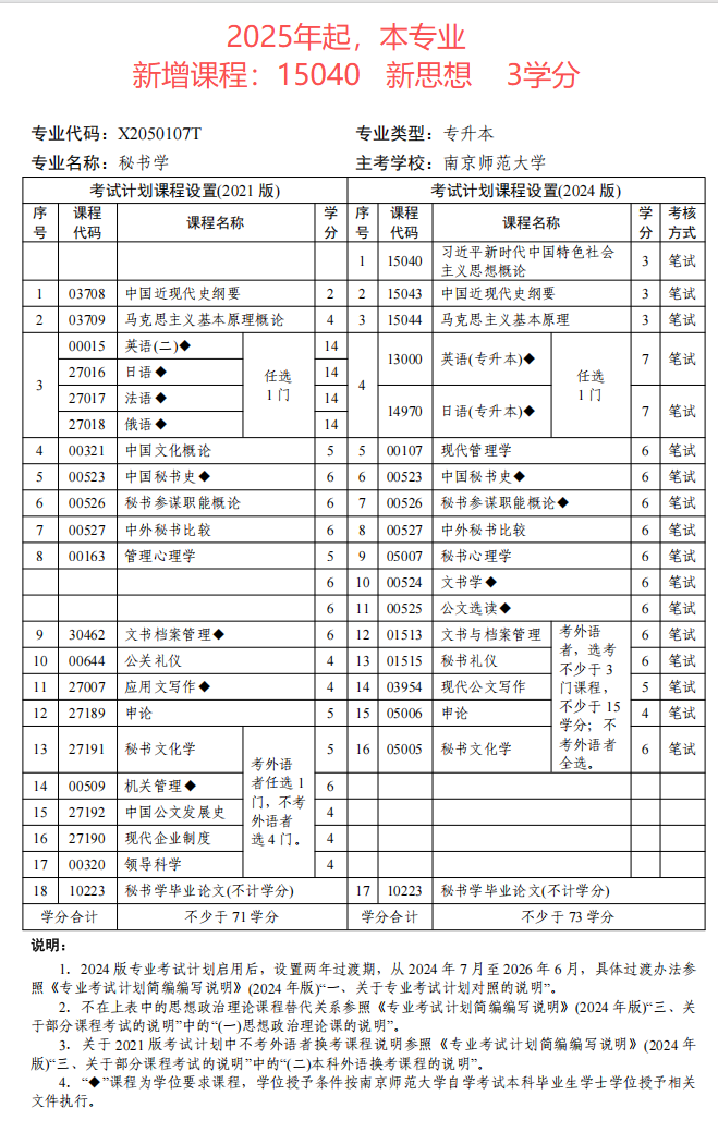 江苏省自考秘书学(本科段)专业考试计划(2024版)