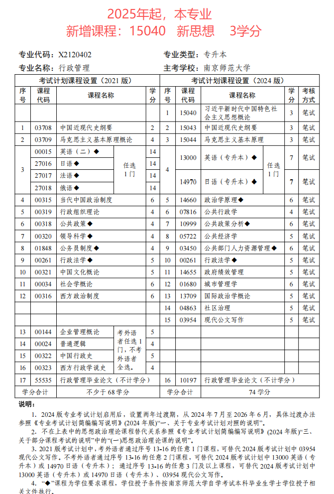 江苏自考行政管理(本科段)专业考试计划(2024版)