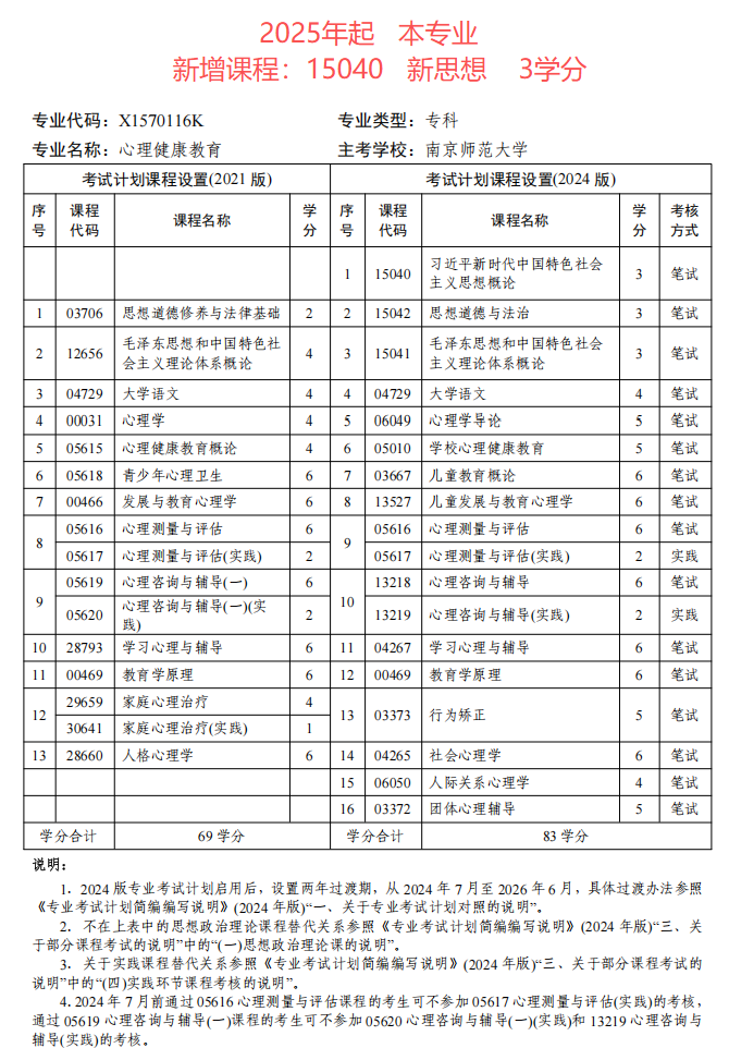 江苏自考心理健康教育(专科段)专业考试计划(2024版)