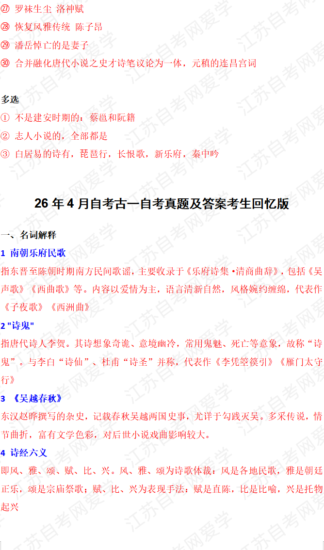 2026年4月自考中国古代文学史真题答案(考生回忆版)