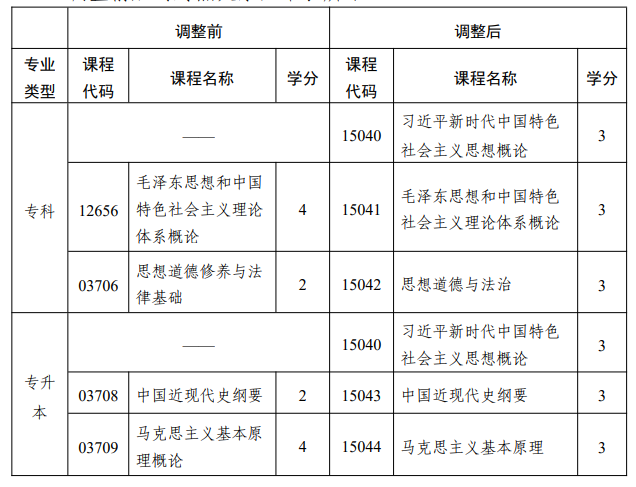 (一)专科专业。思想政治理论课设置由原来2 门调整为3门,共 9 学分,包括“新思想”(课程代码 15040,3 学分)、“毛概”(课程代码 15041,3 学分)和“思想道德与法治”(课程代码 15042,3 学分)。